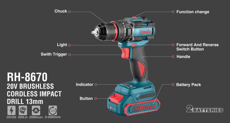 دریل شارژی رونیکس 8670 با سه نظام فلزی 13 میلی متری