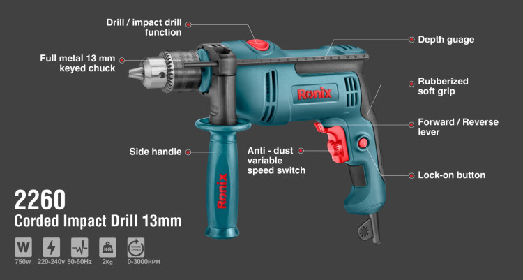 دریل 2260 رونیکس با موتور پر قدرت 750 وات و سه نظام آچاری فلزی 13 میلی متری